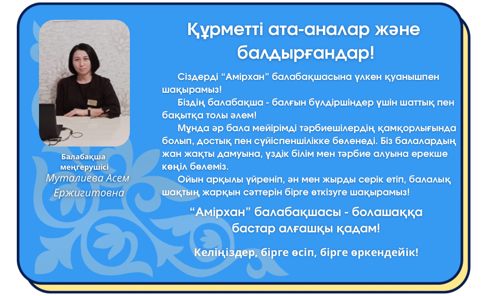 Ұялы телефон 8 7755678283электронды поштасы:asemmutalieva.1983@mail.ruБалабақша сайты: https://Amirhan-balabaqsha.kz |
